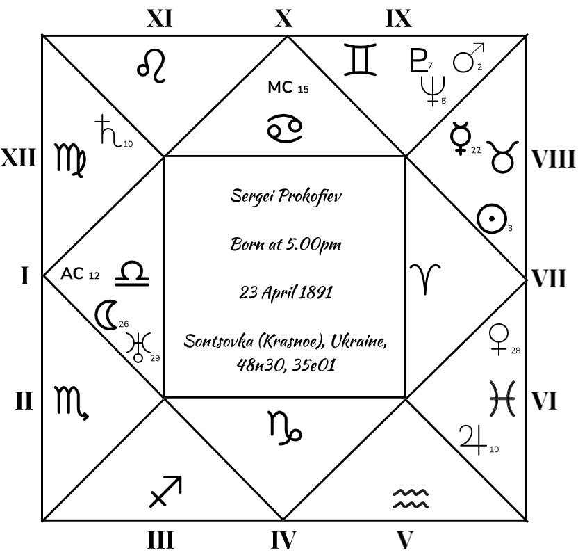 Prokofiev was a sun Taurean in basic terms, the major luminary being placed in the eighth astrological house of shared security. The Bull is ruled by musical, creative Venus and has produced many a great composer.
