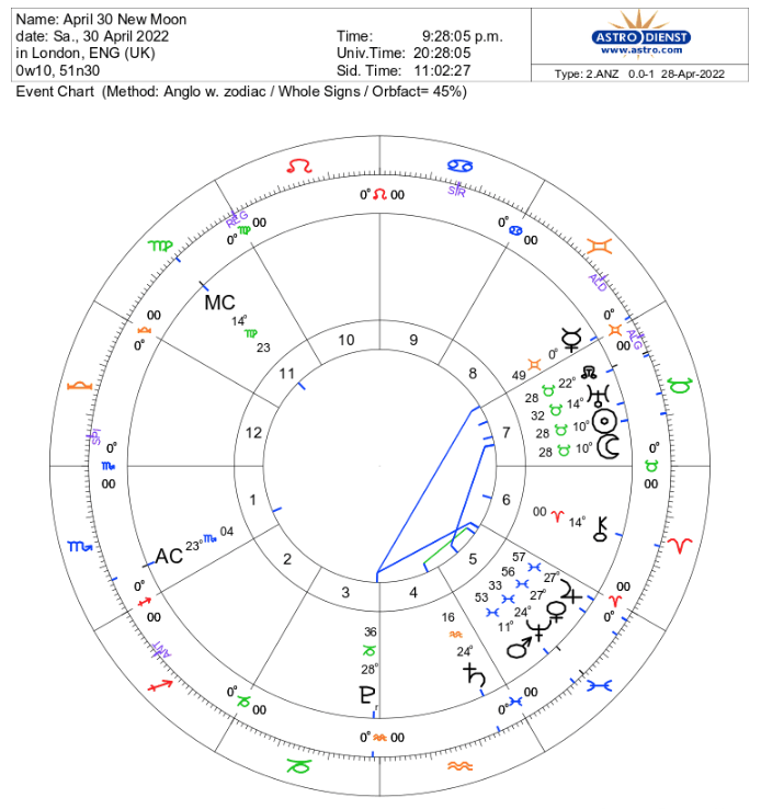 I don’t often sensationalise but this is a really tense and trying looking chart, with the Sun/Moon falling exactly on the ascendant/descendant, and with the sun very close also to Algol – the demon star – in a Taurus first house, along with revolutionary Uranus and the North Node, insisting that we look at ourselves realistically, whilst trying to refrain from extremes.