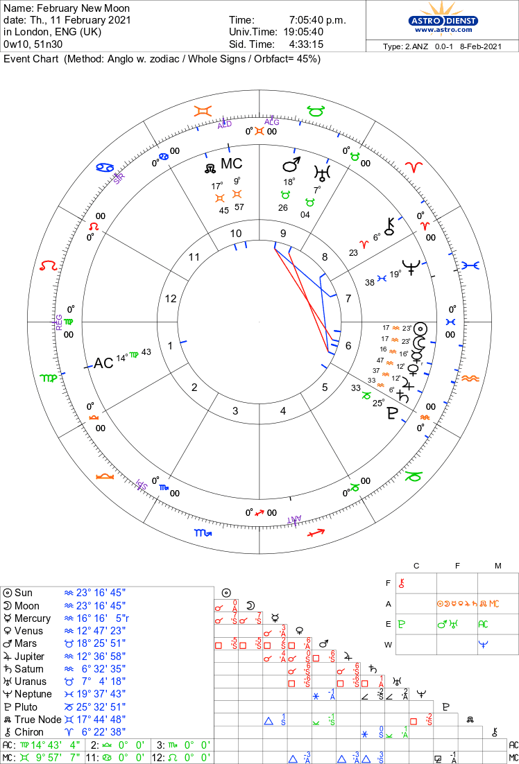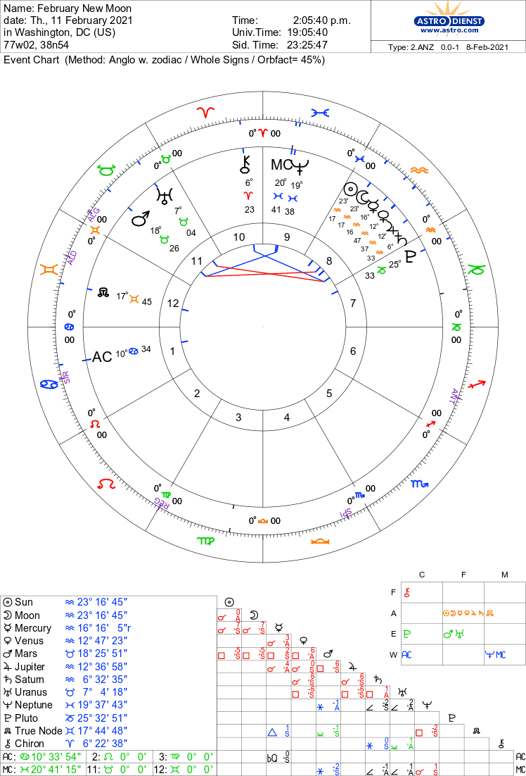 Take the Aquarius New Moon on February 11 2021. Here we have half a dozen planets in the fixed air sign (Aquarius), which is striking.
