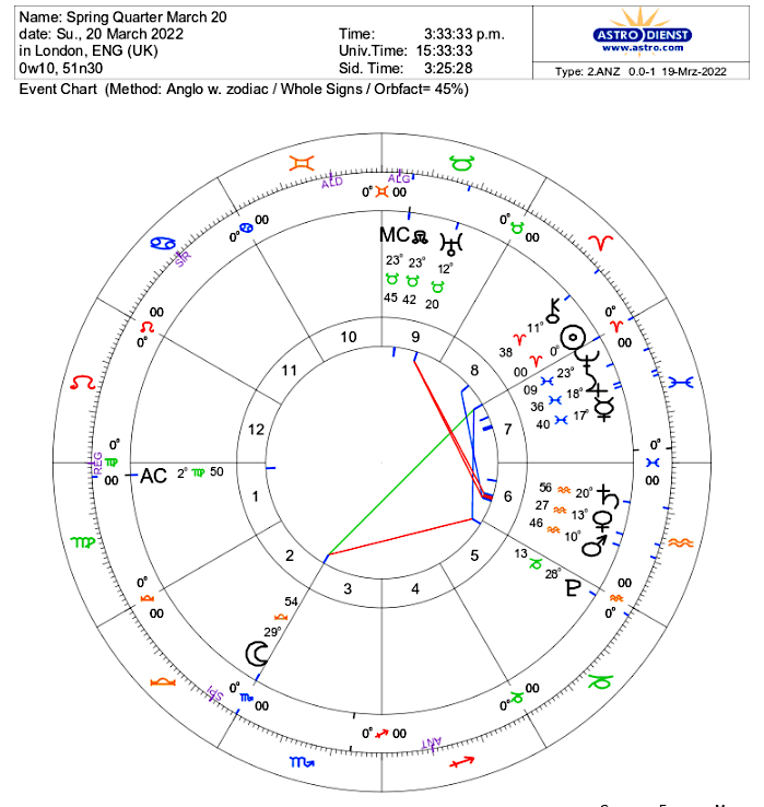 I was more than a little surprised at the time of the Vernal Equinox this year, the First Point of Aries, or the first moment of spring: 3:33:33 PM GMT (set for London).