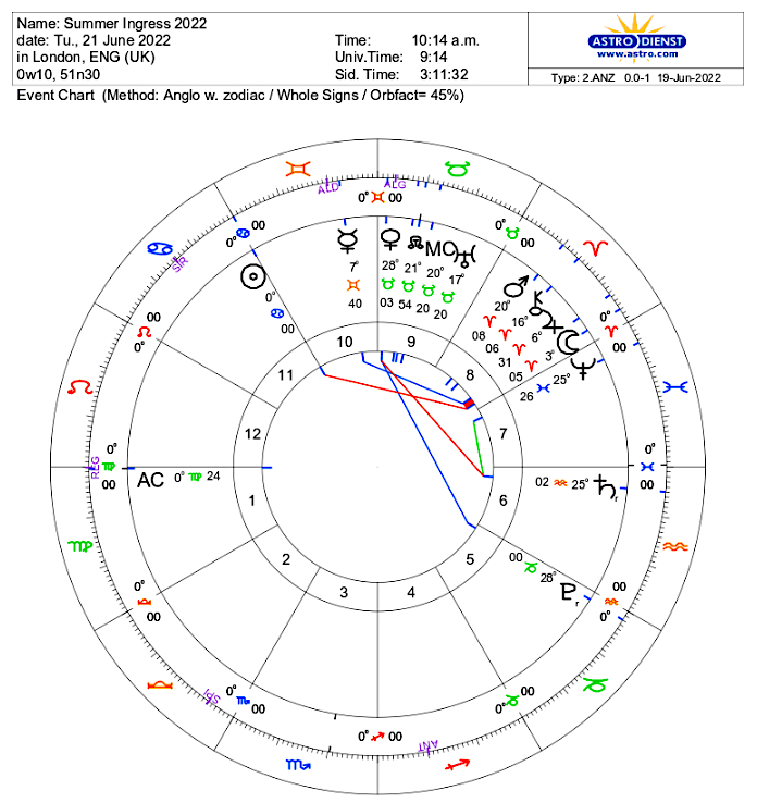 This chart, set for the exact time of the Northern Solstice in London and entry into the first point of Cancer, is indicative of sudden change, particularly financial, economic and political.